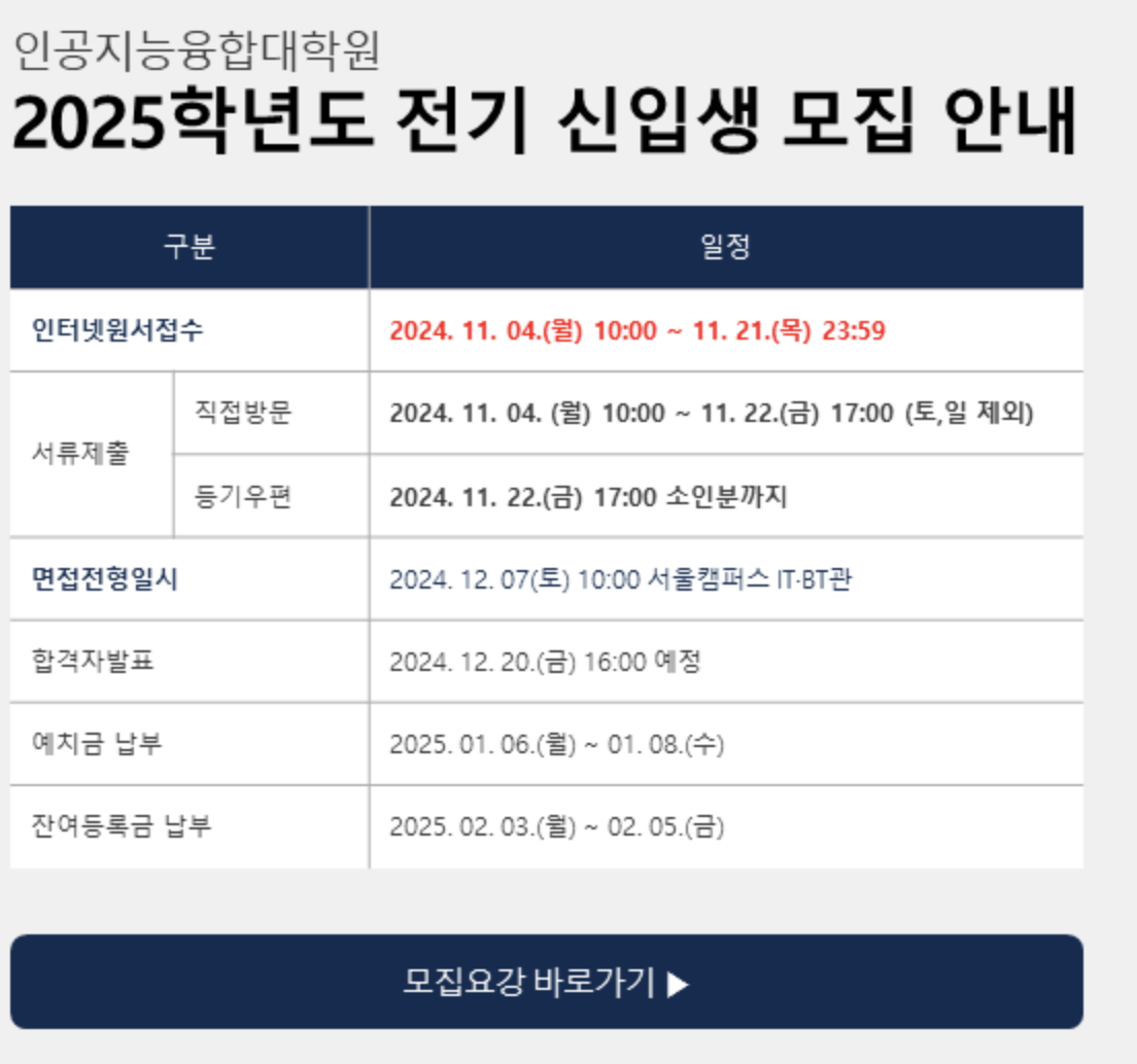 Engineering/coding Ai 과정 지원기록 JINUCHOI 2024. 10. 24. 17:31 대학원에 대해 잘 모르고, 심지어 이미 늦은 줄 알았는데 이런게 떠 있다. 경험해본다 치고 무시성으로 원서접수를 해봐야겠다. 입학원서 버튼을 눌렀다 -> windows 기반에서만 된다고 해서 접었다.. 공유하기 게시글 관리 JINUCHOI.COM 'Engineering/coding' Related Articles 슬램 알람 봇 - 1 (python bolt) markdown에서 수학식을 표시하는 방법 수학 책 추천 세상에서 가장 재미있는 ** 시리즈 (만화)