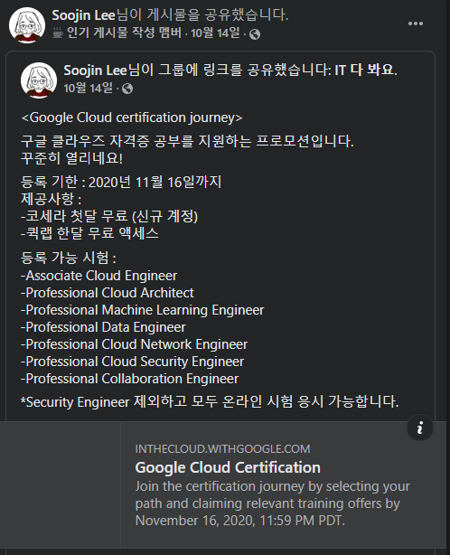 페북에 Google Cloud Certified Korea 라는 그룹이 있습니다.