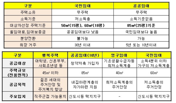 | 국민임대 | 근로자 평균소득 70% 이하 서민계층용 | 전용 59㎡ 이하 | 30년 | |
