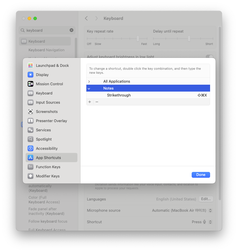 Mac에서 자신만의 단축키를 지정하여 앱이나 Finder에서 메뉴 명령을 수행할 수 있습니다.