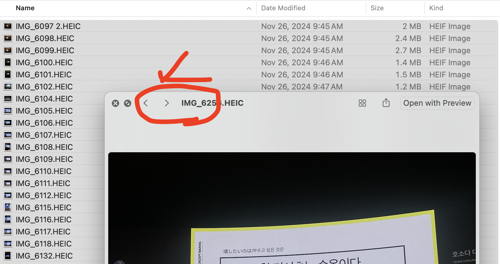 Life Insight/tools [mac] preview 사진 옆으로 넘기기 (사진, 이미지 보는법) jinwoochoi 2024. 11. 29. 16:57 전체 선택 후 + Space 누르면 됩니다. 아래처럼 화살표 있게 열림 이건 preview 로 open한게 아니라 finder 의 기능임. 윈도우 처럼 보고 싶은 사람들 많았을 텐데.. 참고하시길 공유하기 게시글 관리 jinwoochoi.com 'Life Insight/tools' Related Articles [Mac] App shortcut 사용하기(노트앱 취소선) [Mac] 맥 시리즈를 시작하는 이유 [mac] 폴더 디폴트 정렬 Between full-screen applications keyboard short cut in mac